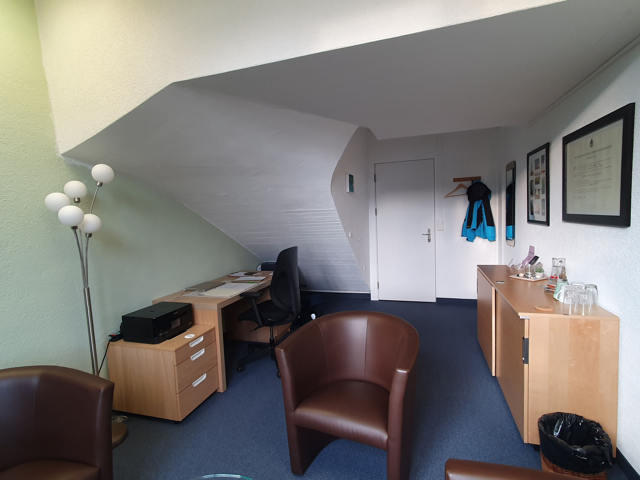 Im Hassler-Haus befindet sich ein Personenaufzug. Dieser befördert Sie in den 2. Stock. Gehen Sie am Anmeldebereich des KAZ vorbei und biegen dann links in den Gang ein. Folgen Sie diesem Gang links vorbei an der Teeküche des KAZ, gehen Sie durch die Glastür und weiter bis ans Ende dieses Ganges. Dort steht ein Wartestuhl mit grünem Kissen und Decke für Sie. Die letzte Tür links führt in mein Therapiezimmer. Ein Frei-Besetzt-Türschild zeigt Ihnen an, ob Sie eintreten können oder auf dem Stuhl neben der Tür Platz nehmen möchten.